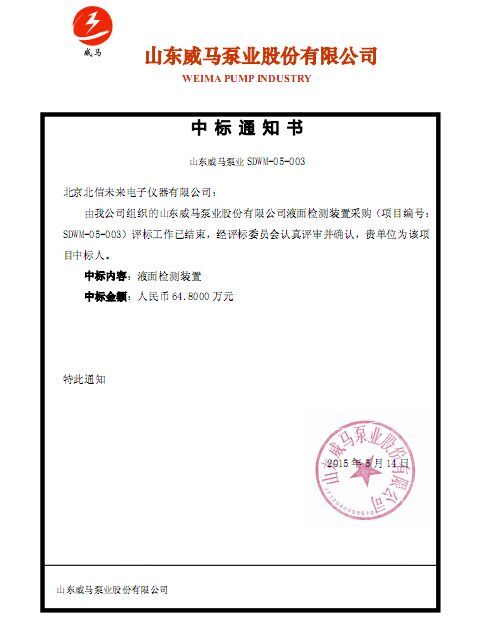 2015年5月,由山東威馬泵業(yè)股份有限公司公開(kāi)招標(biāo)的“液面檢測(cè)裝置”項(xiàng)目中,經(jīng)過(guò)與幾家實(shí)力雄厚的公司激烈競(jìng)標(biāo),最終我公司成功中得該項(xiàng)目的供應(yīng)。
